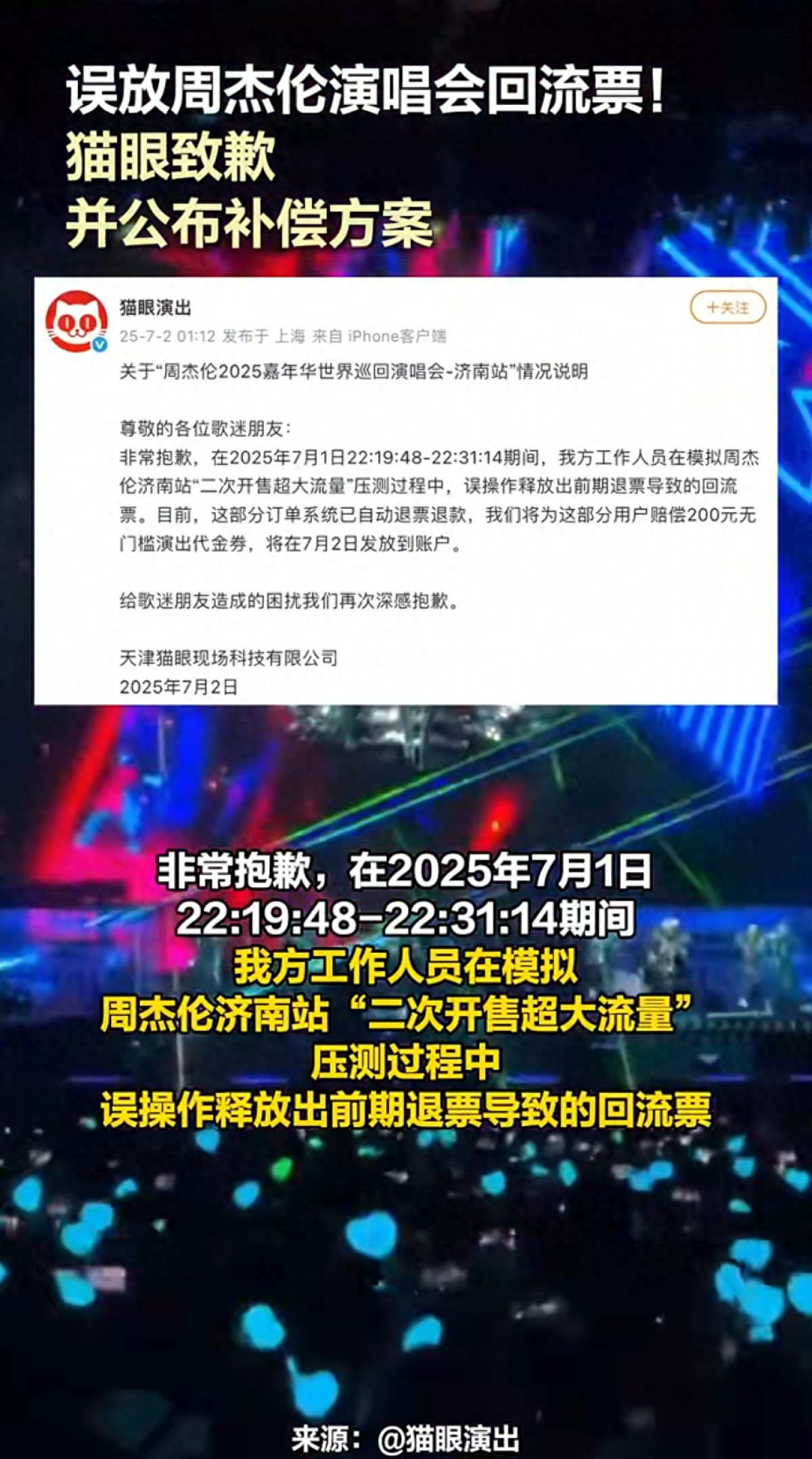 7月2日凌晨,@猫眼演出 发布关于“周杰伦2025嘉年华世界巡回演唱会-济南站”的情况说明并致歉称,在2025年7月1日22:19:48-22:31:14期间,猫眼工作人员在模拟周杰伦济南站“二次开售超大流量”压测过程中,误操作释放出前期退票导致的回流票。