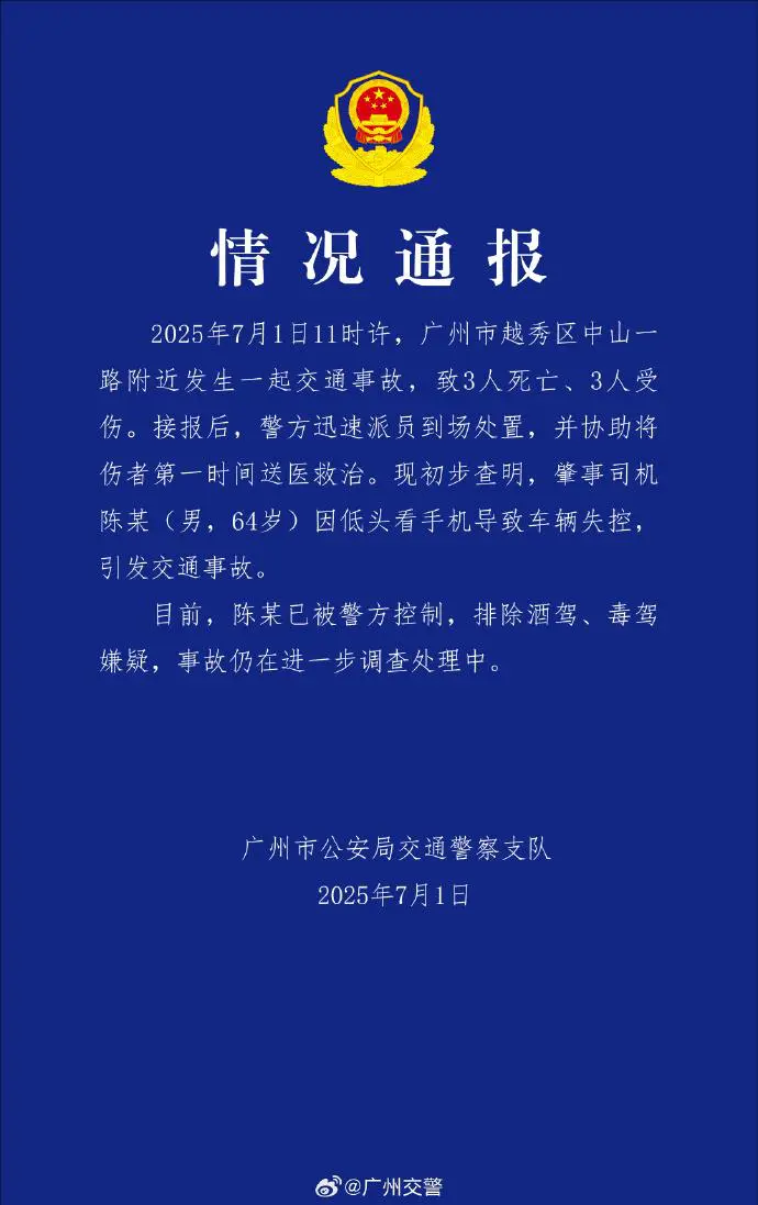7月1日,记者从广州交警获悉,当日11时许,广州市越秀区中山一路附近发生一起交通事故,致3人死亡、3人受伤。接报后,警方迅速派员到场处置,并协助将伤者第一时间送医救治。现初步查明,肇事司机陈某(男,64岁)因低头看手机导致车辆失控,引发交通事故。