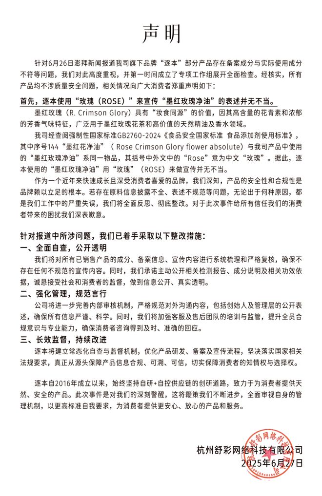 近日,逐本透过官方微信发布声明,称公司旗下所有产品均不涉及质量安全问题,公司将全面自查,对所有已销售产品的成分、备案信息、宣传内容进行系统梳理和严格复核。