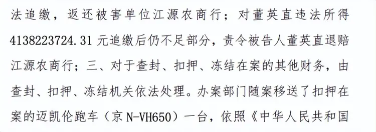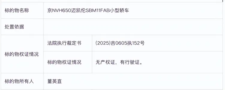 拍卖信息显示,原车主董英直此前为吉林省白山市江源农商银行董事长、法定代表人,因犯职务侵占罪,违法所得超41.38亿元,被判处有期徒刑10年6个月,并处没收个人财产人民币450万元。上述被拍卖的迈凯伦,是对董英直违法所得81.76万元购买对应的份额及其收益依法追缴。