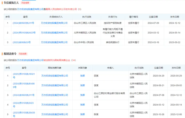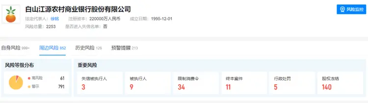 天眼查最新资料显示,目前白山江源农村商业银行股份有限公司共有852条周边风险信息,其中公司股东万方投资控股集团有限公司是被公示的失信公司,并被法院列为限制高消费企业。