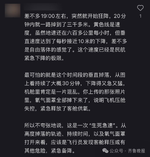 随后有网友补充评论说,19点左右开始狂降,20分钟内落到三千多米,差不多是自由落体的感觉……