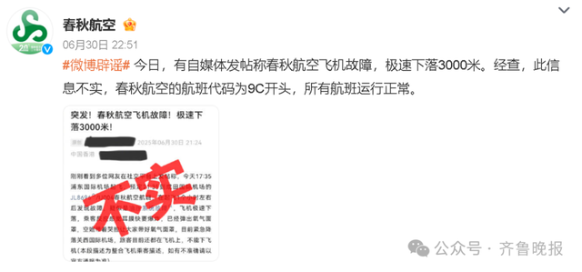6月30日晚,春秋航空官方发布消息:今日,有自媒体发帖称春秋航空飞机故障,极速下落3000米。经查,此信息不实,春秋航空的航班代码为9C开头,所有航班运行正常。