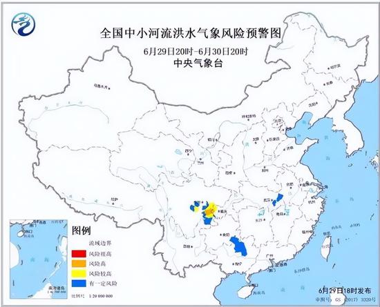 中央气象台6月29日18时发布中小河流洪水气象风险预警:预计,6月29日20时至30日20时,四川中东部、重庆西部等地部分地区发生中小河流洪水的气象风险较高(黄色预警),其中,四川东部、重庆西部等地部分地区发生中小河流洪水的气象风险高(橙色预警)。