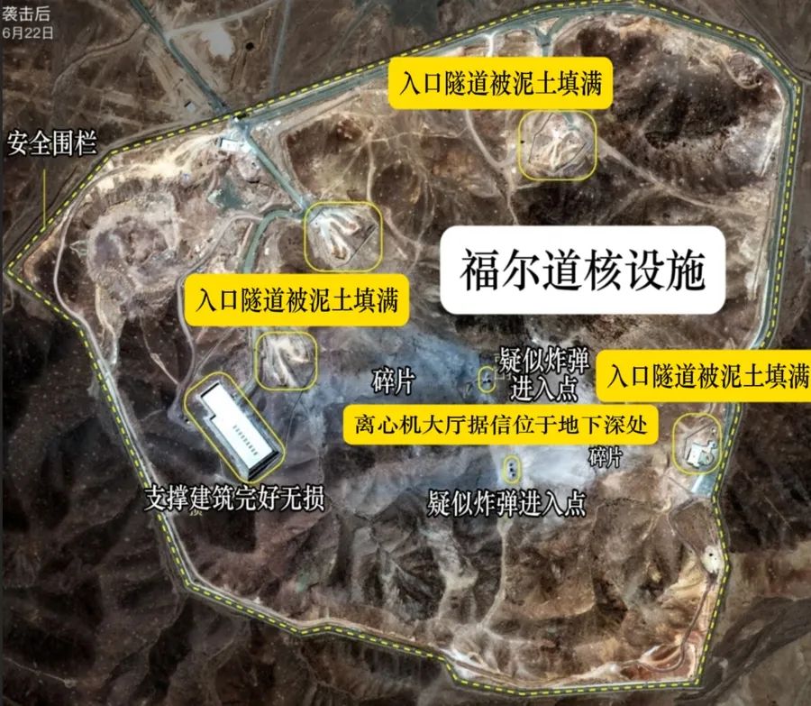 美军21日对福尔道投下12枚重达13.6吨的巨型钻地弹。袭击后的卫星图像显示,地面出现明显变化及灰尘,被认为是钻地弹的打击点。本周早些时候,一份外泄的美军初步评估报告称,美军空袭“封堵”两处入口,但未能摧毁地下建筑。