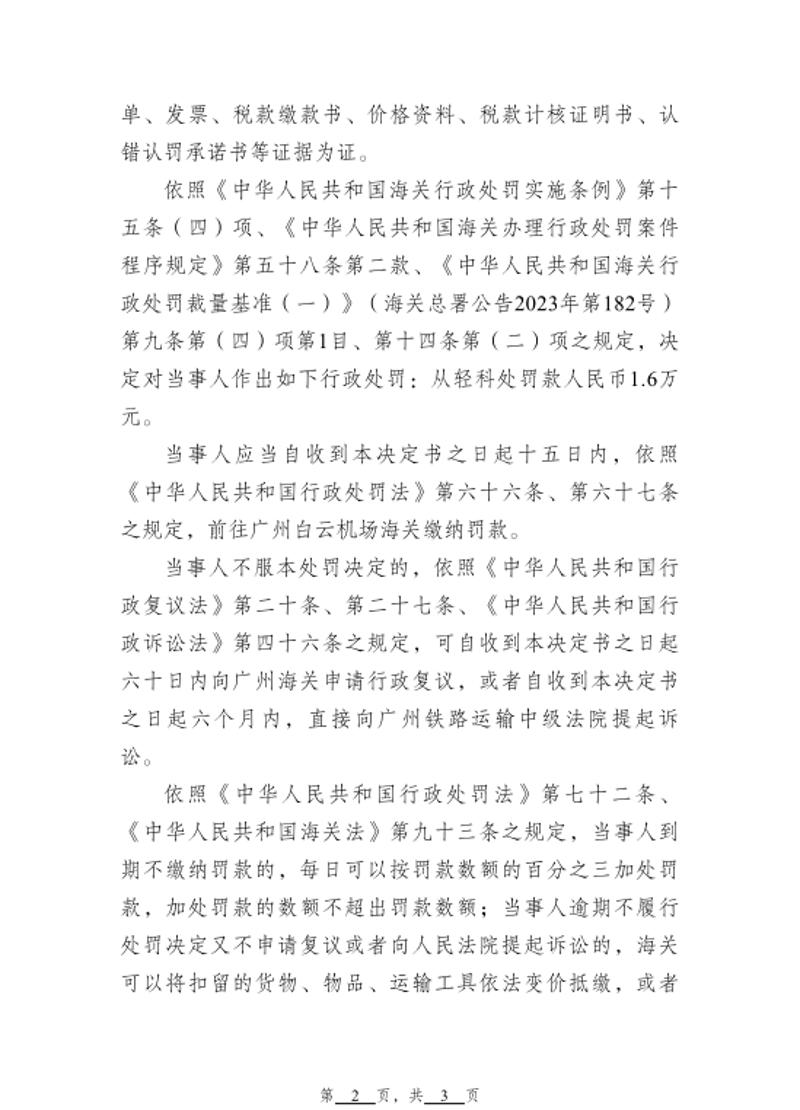 依照《中华人民共和国海关行政处罚实施条例》第十五条(四)项、《中华人民共和国海关办理行政处罚案件程序规定》第五十八条第二款、《中华人民共和国海关行政处罚裁量基准(一)》(海关总署公告2023年第182号)第九条第(四)项第1目、第十四条第(二)项之规定,决定对当事人作出如下行政处罚:从轻科处罚款人民币1.6万元。