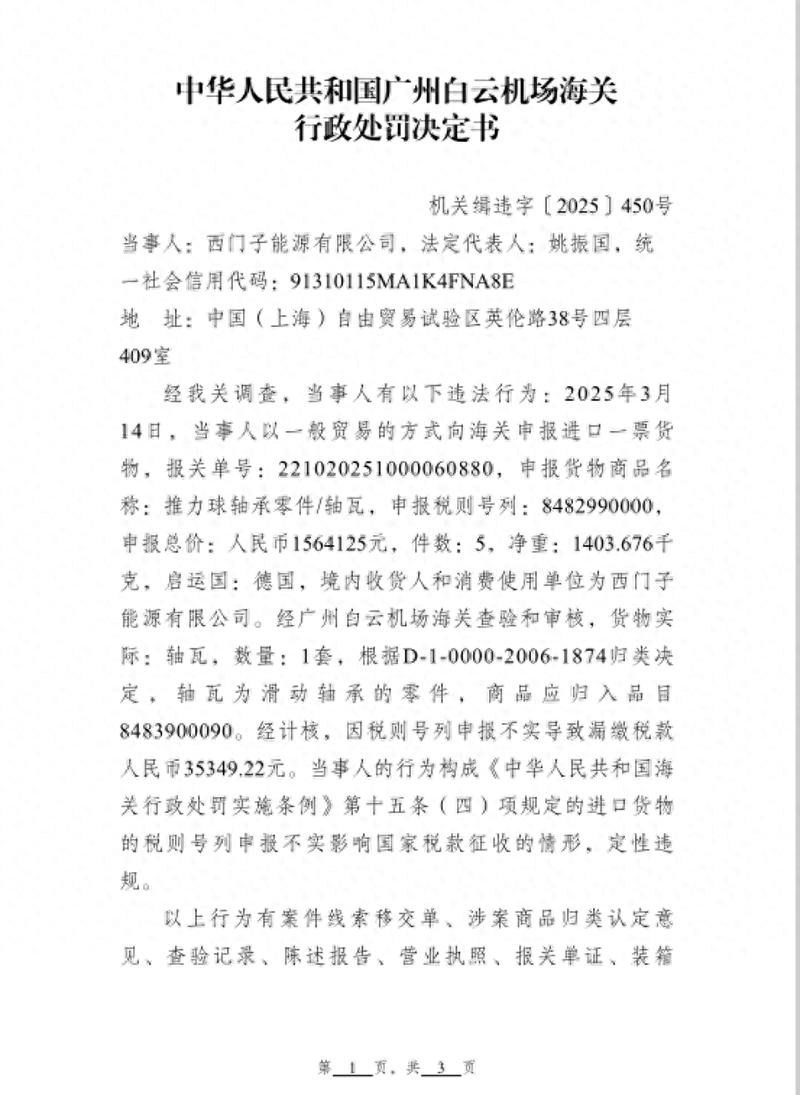 6月24日,广州白云机场海关发布对西门子能源有限公司的行政处罚决定书。