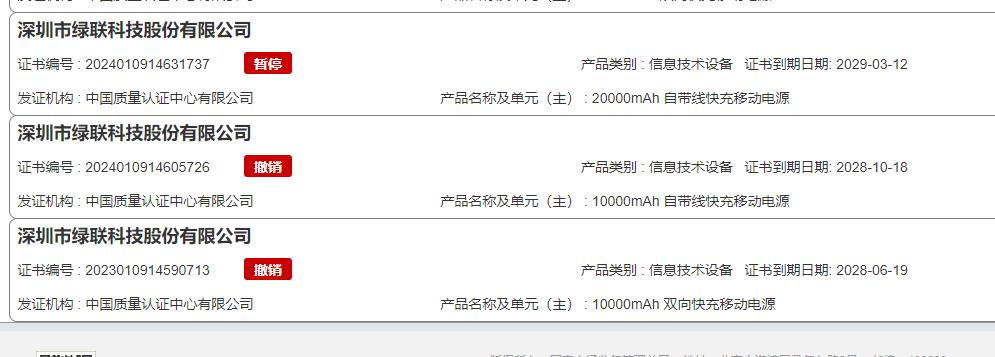 (绿联科技部分移动电源3C认证被暂停,图源:全国认证认可信息公共服务平台)
