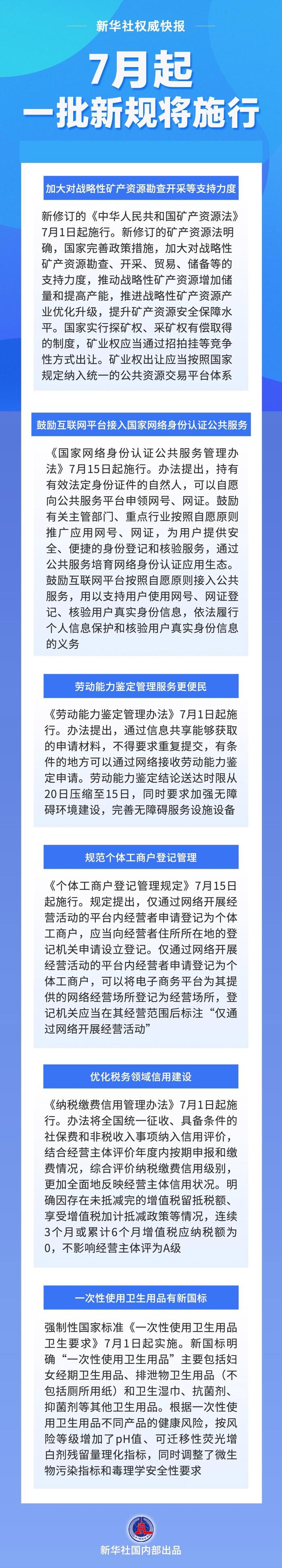 鼓励互联网平台接入国家网络身份认证公共服务;劳动能力鉴定管理服务更便民;规范个体工商户登记管理……7月起,一批新规将施行,一起来看!