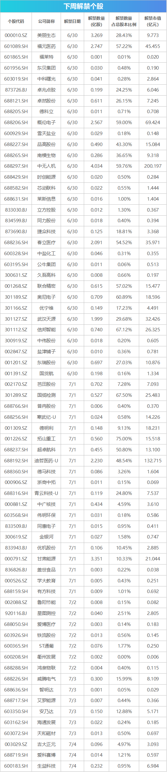 下周(6月30日-7月4日)A股有68只个股面临解禁,按照最新收盘价计算,对应市值合计超816亿元。其中,中无人机限售股解禁市值超200亿元。