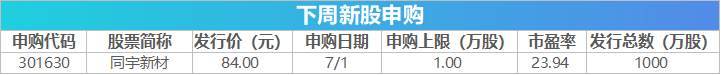 Wind数据显示,下周(6月30日-7月4日)将有1只新股发行,股票简称为同宇新材。该公司拟在创业板上市,主营业务为电子树脂的研发、生产和销售,主要应用于覆铜板生产。