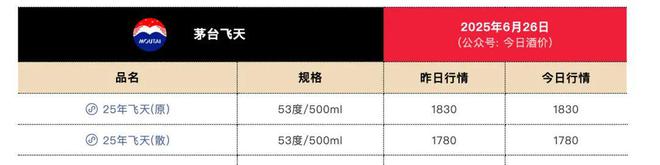 6月26日,第三方平台“今日酒价”数据显示,25年飞天茅台(53度/500ml)散瓶批发价报1780元/瓶,已连续两天低于1800元。