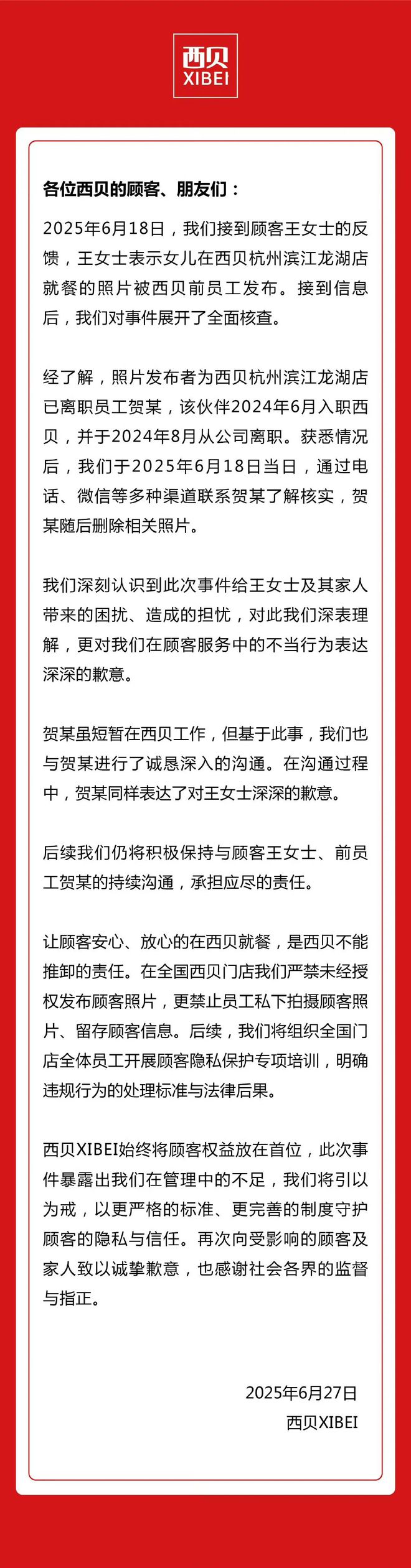 近日,西贝因一起员工偷拍顾客照片事件引发广泛关注。6月27日,西贝在官方微博发布情况说明并致歉。