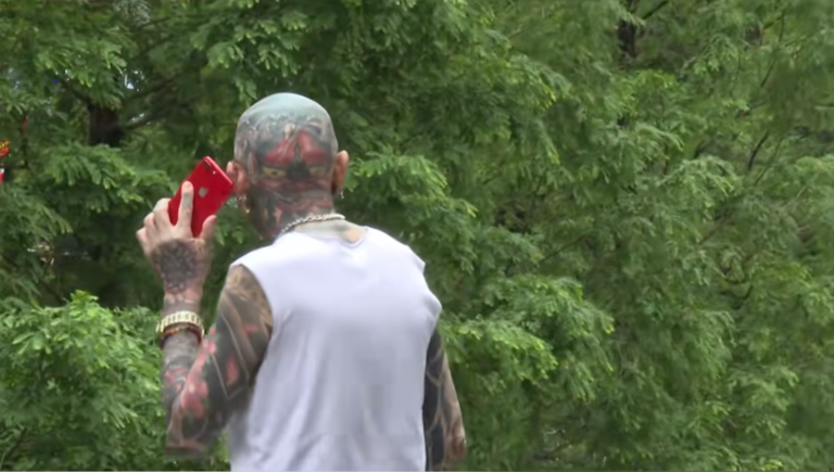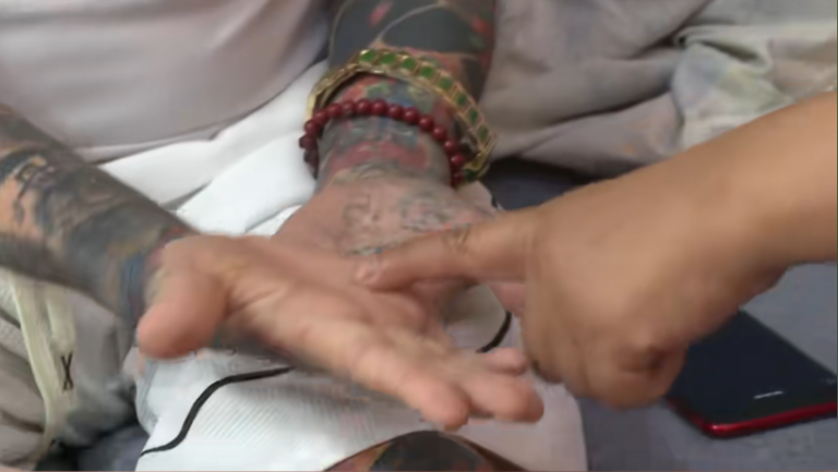 现在从头到脚都被彩色纹身覆盖,只剩下右手手心的皮肤没有纹。
