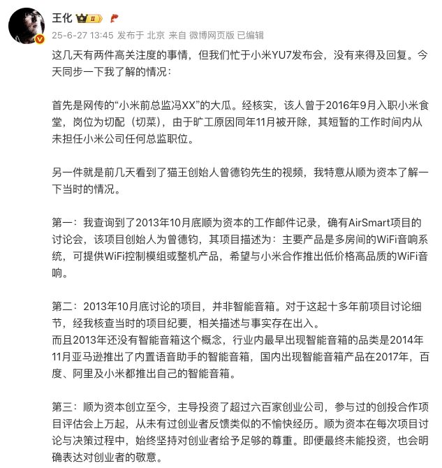 6月27日,针对网传的“小米前总监冯XX”的大瓜,小米集团公关部总经理王化在社交平台发文回应。他表示,“经核实,该人曾于2016年9月入职小米食堂,岗位为切配(切菜),由于旷工原因同年11月被开除,其短暂的工作时间内从未担任小米公司任何总监职位。”