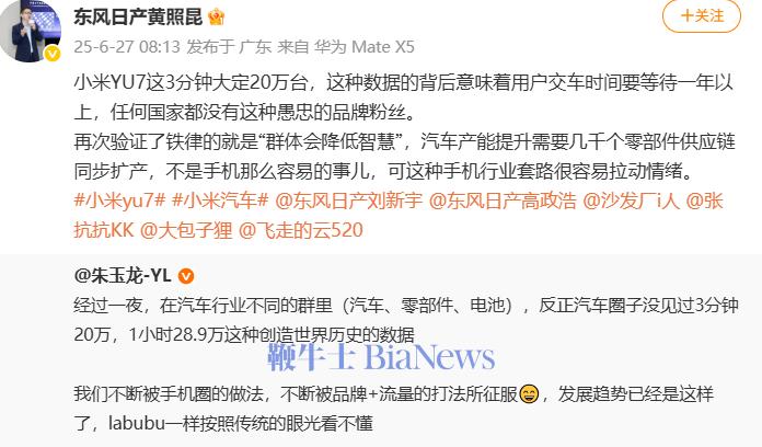 6月27日,针对“小米YU7 3分钟大定20万台”,东风日产三电和动力开发负责人黄照昆今日发文称,这种数据的背后意味着用户交车时间要等待一年以上,并称“任何国家都没有这种愚忠的品牌粉丝”。