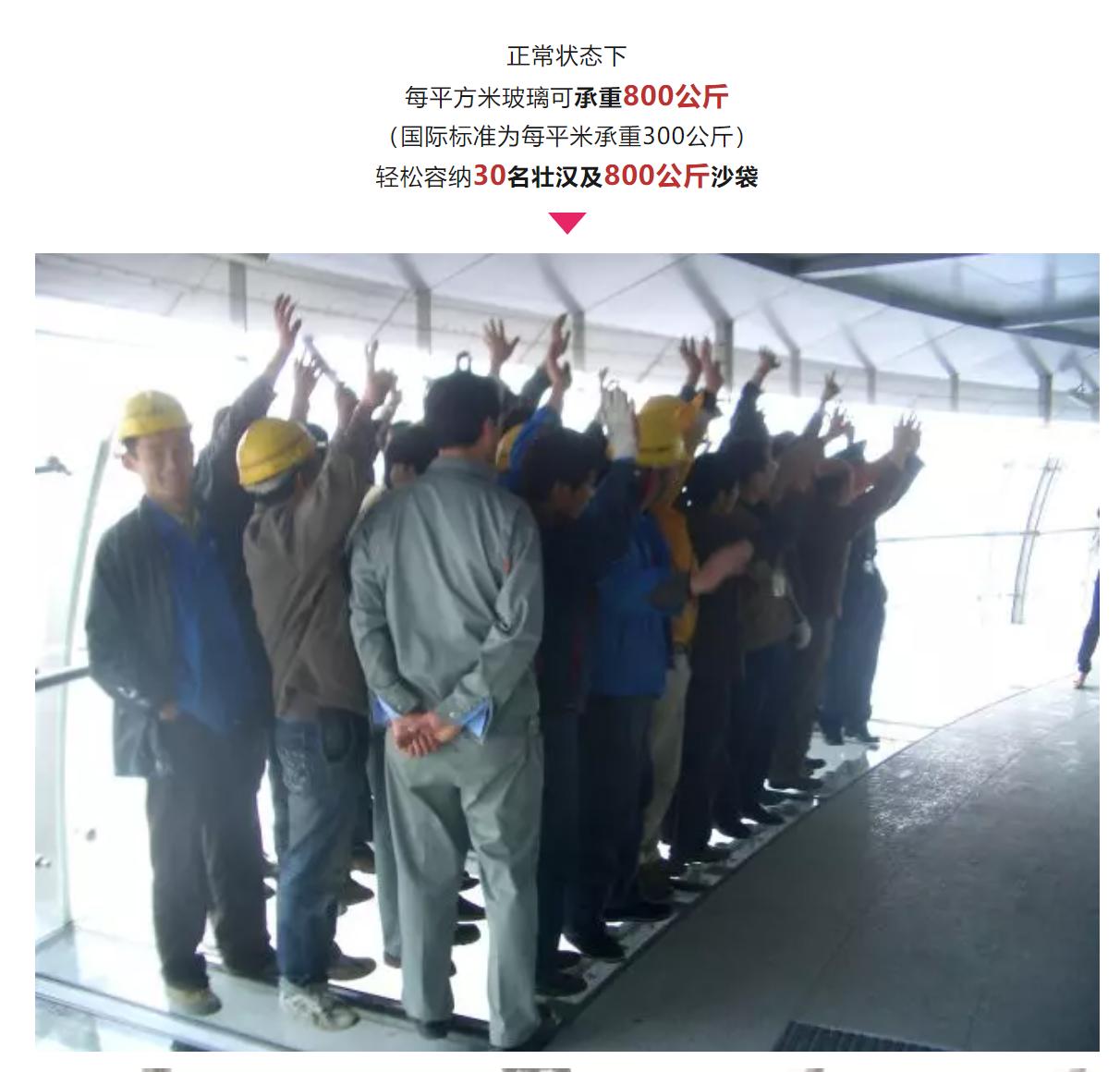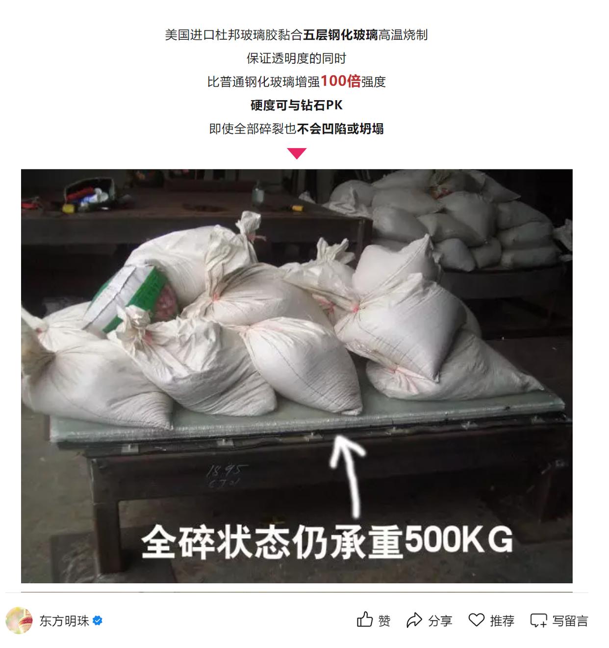 微信号“东方明珠”2018年曾发布一篇文章,其中介绍,全球唯一360°全透明悬空观光廊位于东方明珠电视塔第二大球体,“美国进口杜邦玻璃胶黏合五层钢化玻璃高温烧制,保证透明度的同时,比普通钢化玻璃增强100倍强度,硬度可与钻石PK,即使全部碎裂也不会凹陷或坍塌。”“正常状态下,每平方米玻璃可承重800公斤(国际标准为每平方米承重300公斤),轻松容纳30名壮汉及800公斤沙袋。”