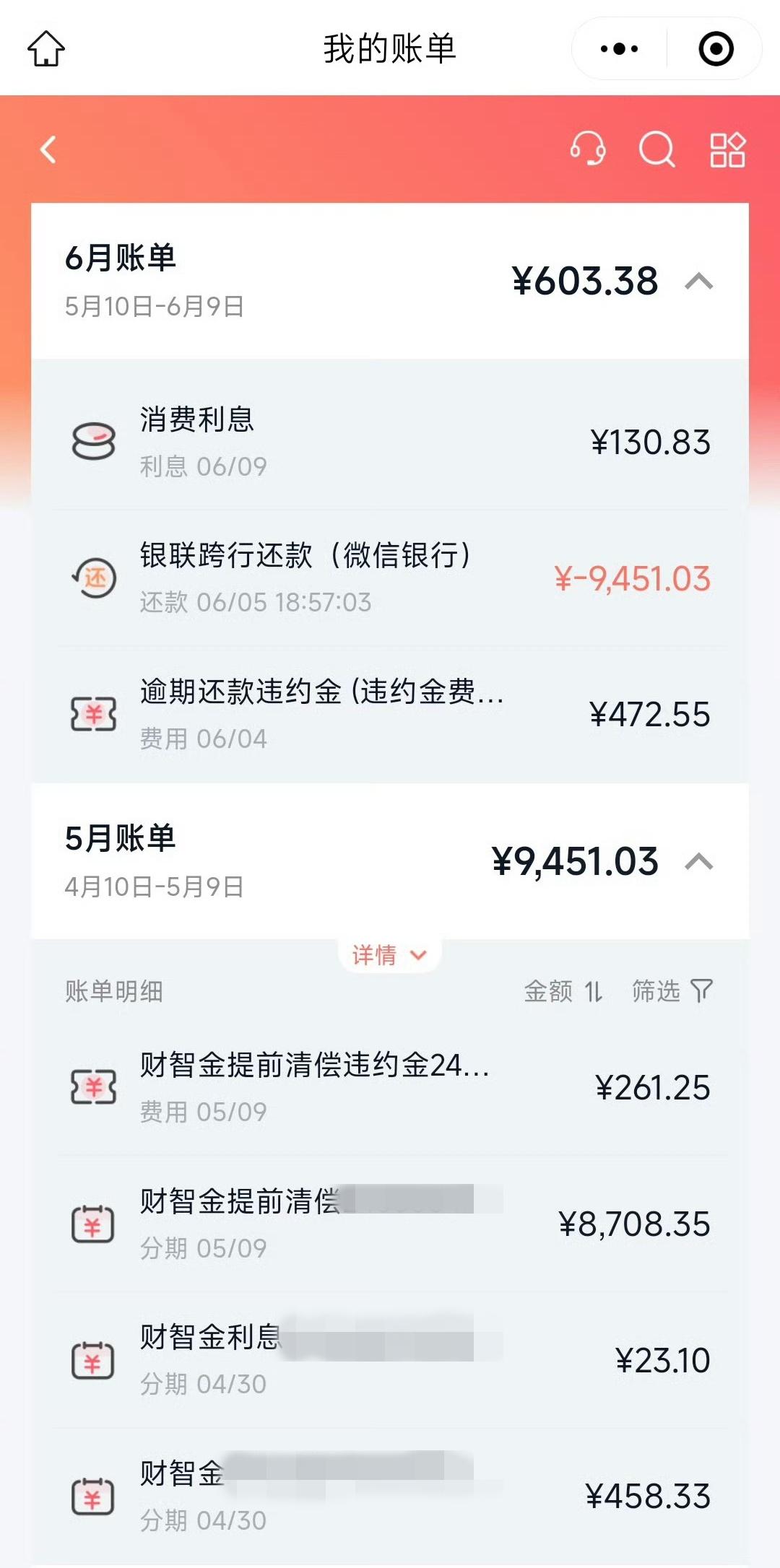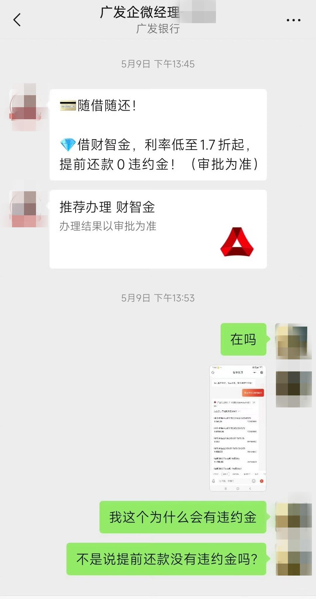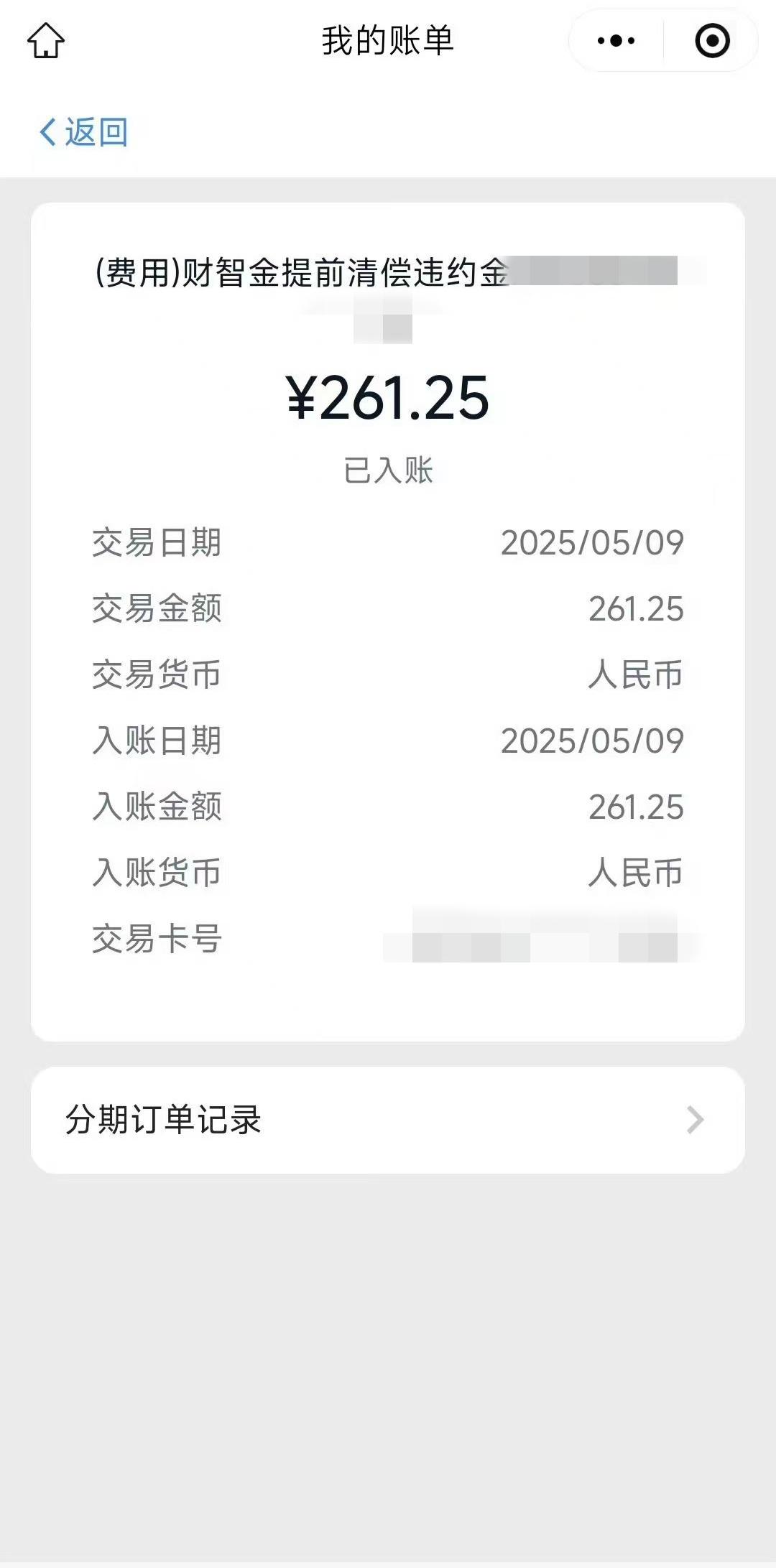 谭先生称,他正常分期还款到今年5月初,5月9日,该企微经理再次向其推送“财智金随借随还,0违约金提前还款”的宣传内容,于是打算提前结清债务,但实际操作后,手机却显示有261.25元的“提前还款违约金入账”。