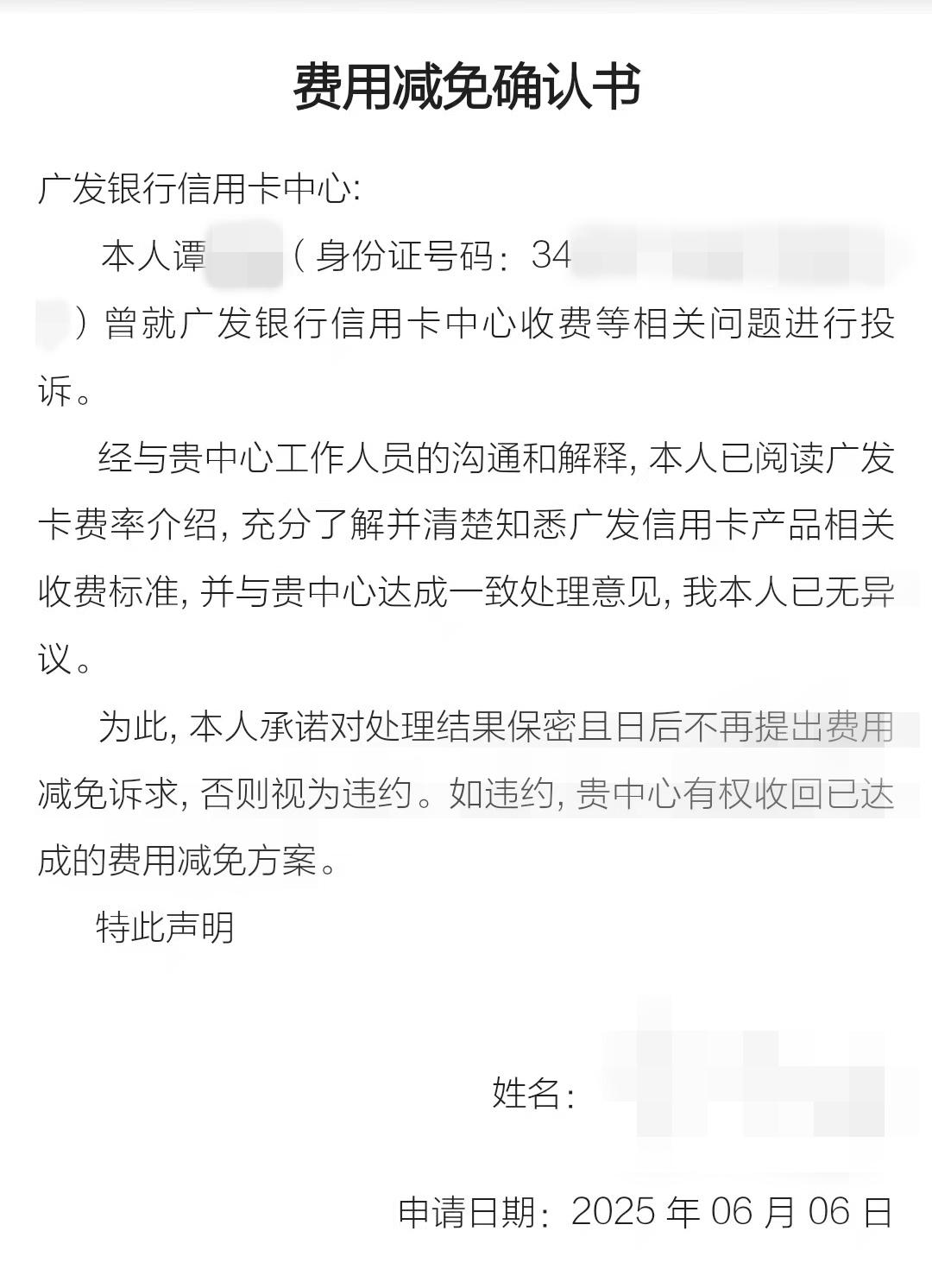 据谭先生介绍,在多方投诉下,广发银行客户经理与其协商,6月6日签署了603.38元的费用减免确认书。但该经理随后反悔了,称减免费用未申请下来,提出以小礼品(养生壶)作为替代解决方案,被他严词拒绝。后续沟通中,该经理又以谭先生“未按时还款”为由拒绝退还逾期违约金和利息,仅愿提供四件套礼品作为补偿。