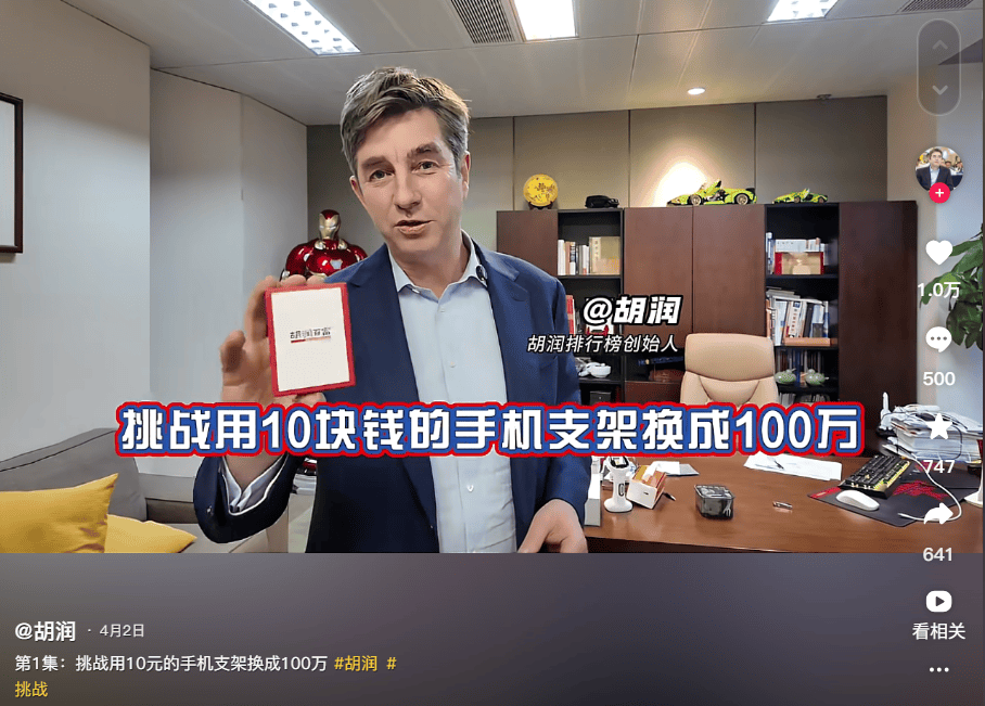 今年,胡润排行榜的创始人胡润发起了一项挑战:以10元的手机支架为起点,找不同的企业家以物换物,最终目标为100万元,所筹集的钱款将会捐出。