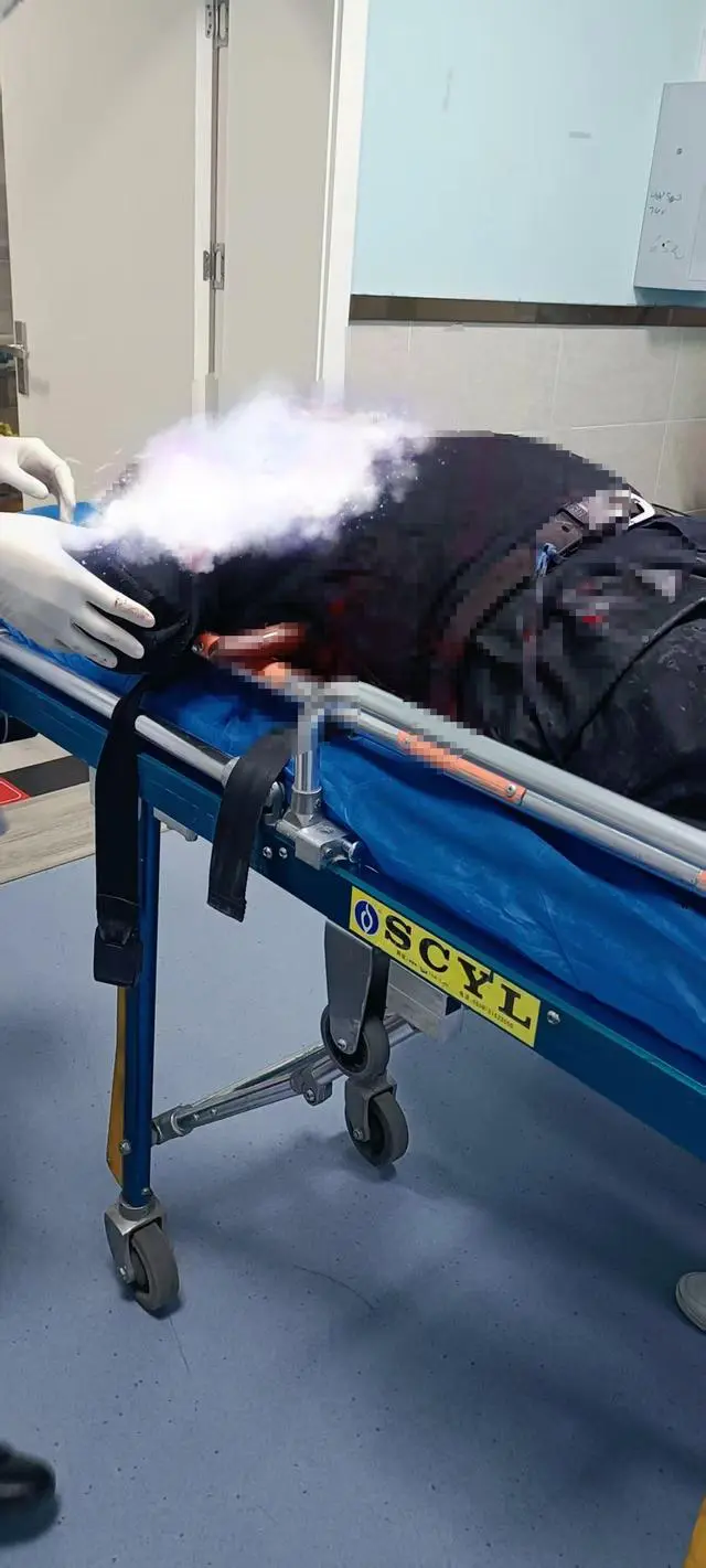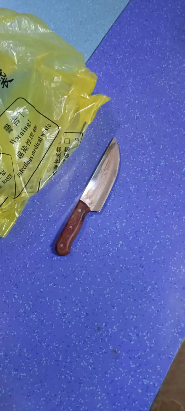 陈女士说,她赶到现场时看到父亲躺在地上,胸部右侧插着一把刀,120赶到现场后将父亲紧急送到附近的北碚区中医院抢救,最终脱离了生命危险。