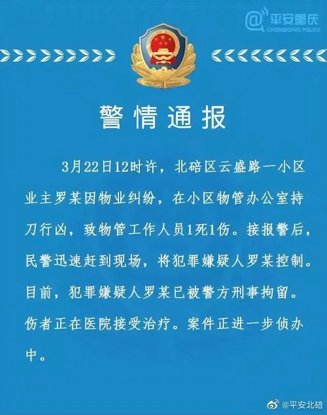 重庆市北碚区公安分局曾发布警情通报称,3月22日12时左右,业主罗某因物业纠纷,在小区物管办公室持刀行凶,致物管工作人员1死1伤。接警后,民警迅速赶到现场,将嫌疑人罗某控制。