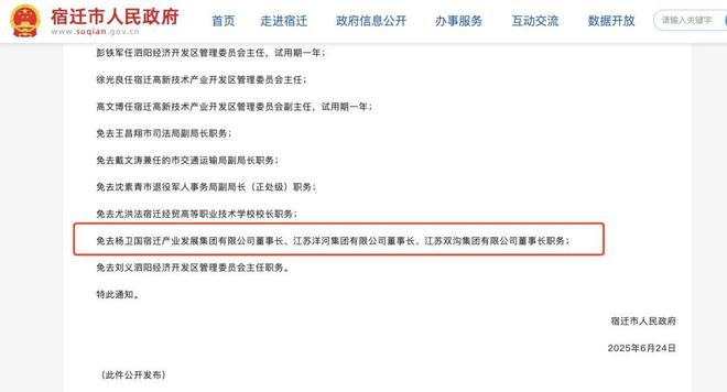 6月25日,宿迁市人民政府官网发布了一则人事任免通知,其中提到“免去杨卫国宿迁产业发展集团有限公司董事长、江苏洋河集团有限公司董事长、江苏双沟集团有限公司董事长职务”。