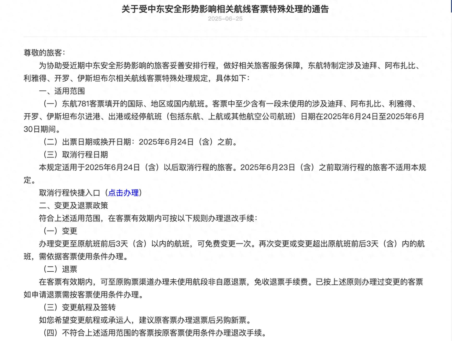 根据东航通告,旅客在2025年6月24日(含)之前购买的东航781客票填开的国际、地区或国内航班,客票中至少含有一段未使用的涉及迪拜、阿布扎比、利雅得、开罗、伊斯坦布尔进港、出港或经停航班(包括东航、上航或其他航空公司航班),且出行日期在2025年6月24日至2025年6月30日期间,可在客票有效期内按照规则办理退改手续。