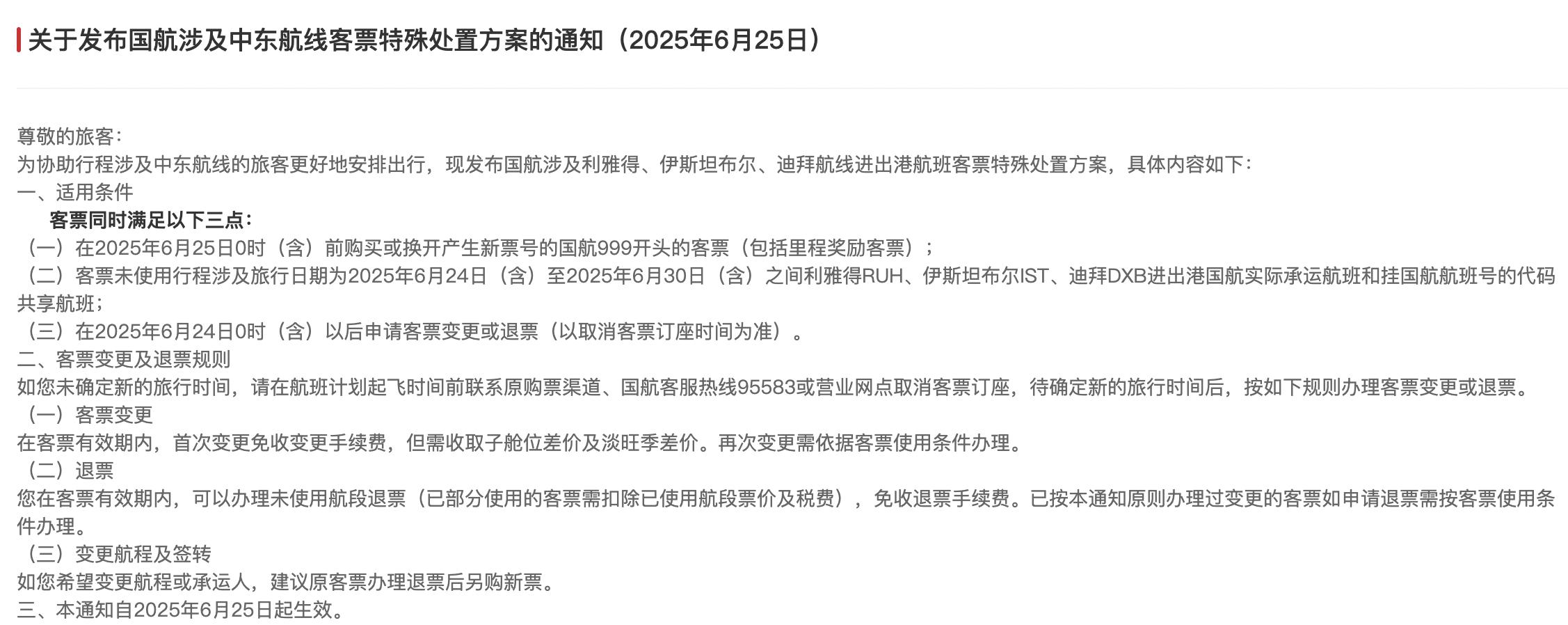 中国国航的最新公告显示,旅客在6月25日0时(含)前购买或换开产生新票号的国航999开头的客票,且客票未使用的行程涉及旅行日期为6月24日(含)至6月30日(含)之间利雅得、伊斯坦布尔、迪拜进出港的国航实际承运航班和挂国航航班号的代码共享航班,可在6月24日0时(含)以后申请客票变更或退票(以取消客票订座时间为准)。
