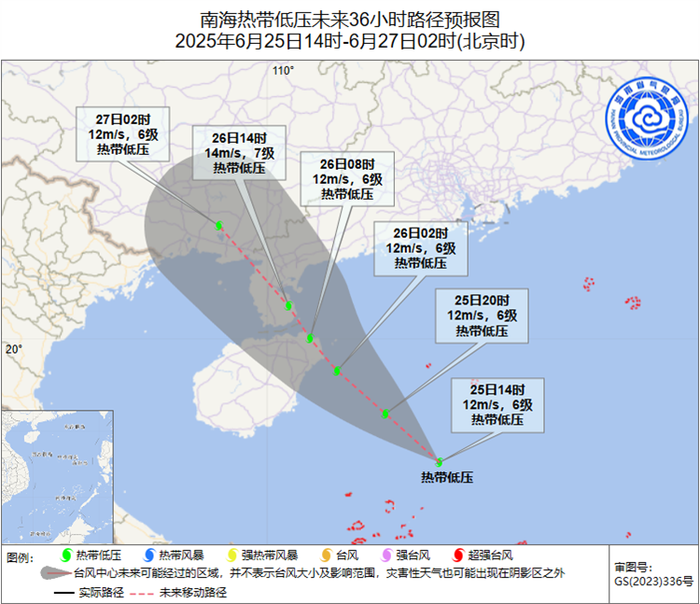 海南省气象台预计,热带低压将以每小时20-25公里左右的速度西北行趋向海南岛东部到广东西部一带沿海,强度变化不大,并将于26日早晨到上午在上述沿海登陆,尔后强度逐渐减弱。受其影响:25日~26日,南海大部分海域风力将逐渐增大,部分海区有8~9级阵风;西沙、中沙和南沙群岛各岛礁以及海南岛东北半部地区有大到暴雨、局地大暴雨。