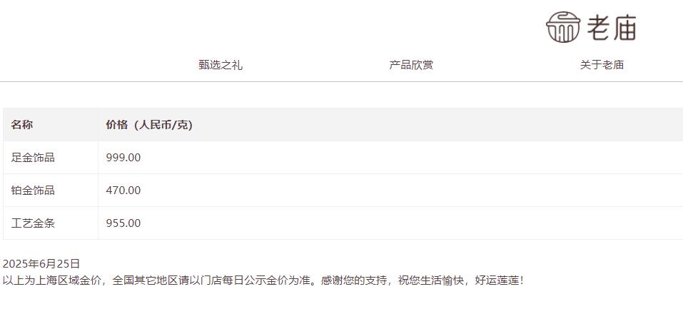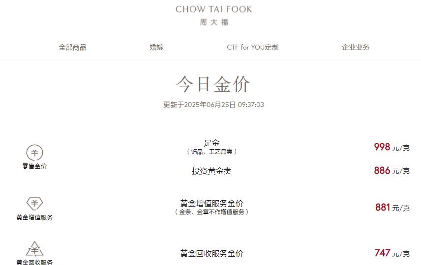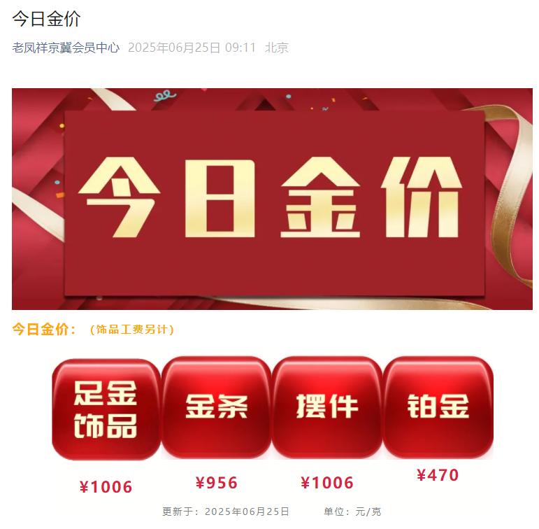 中新经纬查询发现,受此影响,25日国内金饰价格普遍下跌,单克纷纷跌至千元前后。周大福足金价格为998元/克,单克较前一日下跌14元;老庙黄金为999元/克,单克较前一日下跌8元;老凤祥为1006元/克,较前一日下跌6元;周生生金饰价格为1005元/克,较前一日下跌8元。