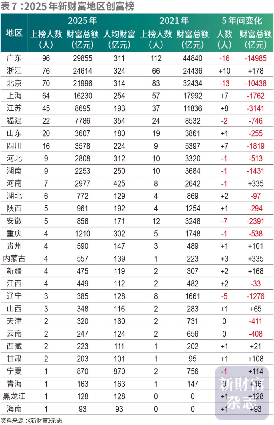 2025年,有高达19个省份的首富,不同于2021年,即5年时间,有高达2/3的省份首富有所变动(表8)。