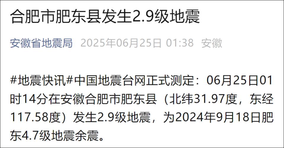 据中国地震台网正式测定,6月25日1时14分在安徽合肥市肥东县发生2.9级地震,震源深度17公里,震中位于北纬31.97度,东经117.58度。