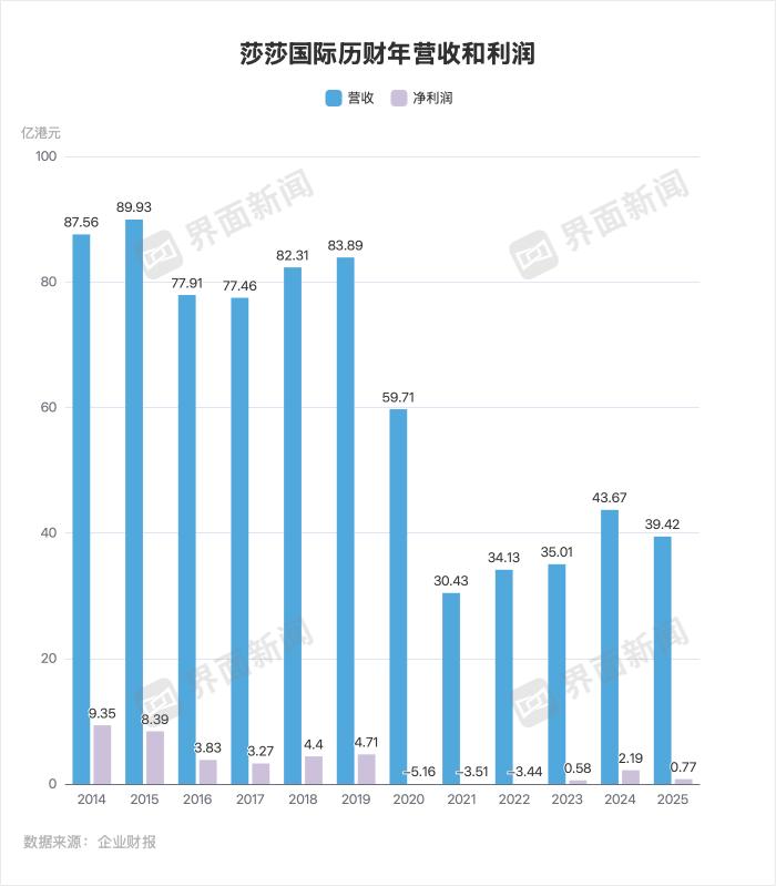 而作为对比,在约十年前的业绩巅峰期,莎莎国际营收曾逼近90亿港元,净利润一度突破9亿港元。