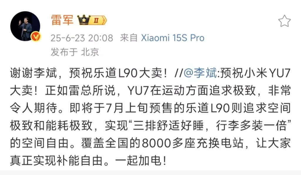 对于李斌的祝福,雷军回复称:“谢谢李斌,预祝乐道L90大卖!”