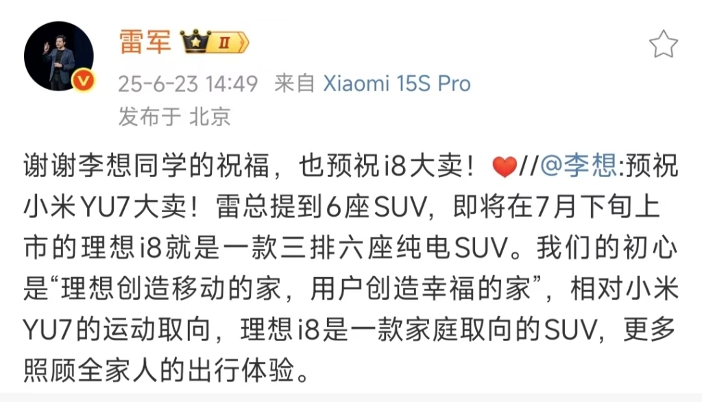 理想汽车CEO李想也同样送上了祝福:“预祝小米YU7大卖!雷总提到6座SUV,即将在7月下旬上市的理想i8就是一款三排六座纯电SUV。我们的初心是“理想创造移动的家,用户创造幸福的家”,相对小米YU7的运动取向,理想i8是一款家庭取向的SUV,更多照顾全家人的出行体验。”
