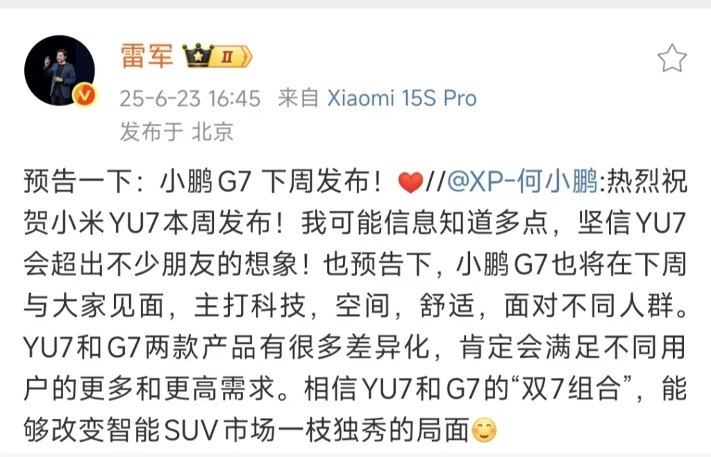 小鹏汽车创始人何小鹏转发雷军官宣微博并表示:“我可能信息知道多点,坚信YU7会超出不少朋友的想象!也预告下,小鹏G7将在下周与大家见面,主打科技、空间、舒适,面对不同人群。相信YU7和G7的‘双7组合’,能够改变智能SUV市场一枝独秀的局面。”