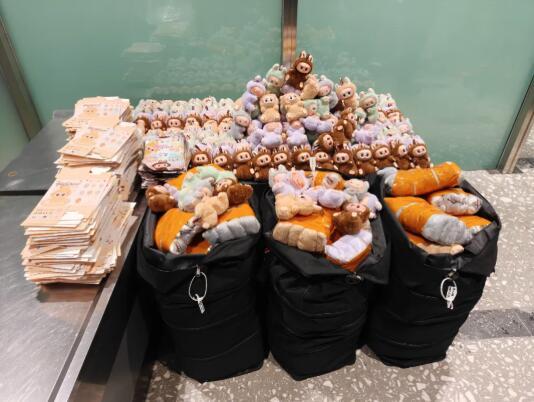 据海关发布微信公众号消息,近日,北京海关所属大兴机场海关关员对出境航班进行监管时,发现一名旅客的行李物品机检图像异常。经开箱查验,现场关员在其托运行李中查获印有“POP MART”(泡泡玛特)品牌标识的玩偶和包装盒。经清点,共查获玩偶952个,塑料包装袋及纸质包装盒1586件。