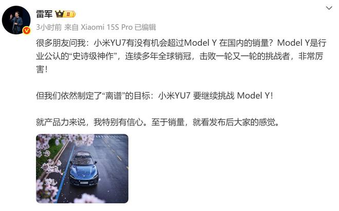 雷军称,很多朋友问我:小米YU7有没有机会超过Model Y在国内的销量?Model Y是行业公认的“史诗级神作”,连续多年全球销冠,击败一轮又一轮的挑战者,非常厉害!但我们依然制定了“离谱”的目标:小米YU7要继续挑战Model Y!就产品力来说,我特别有信心。至于销量,就看发布后大家的感觉。