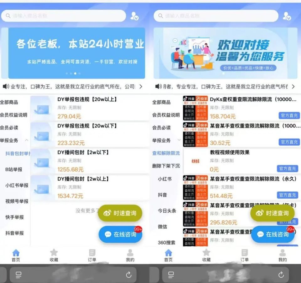 “我们提供全套服务,无效包退款。”一位服务商向蓝鲸记者展示了他们的专业服务网站,网站显示业务范围涵盖水军刷量控评、造谣抹黑、代举报投诉、恶意封号、删除负面信息等多种类型,俨然形成一站式的“黑产服务超市”。