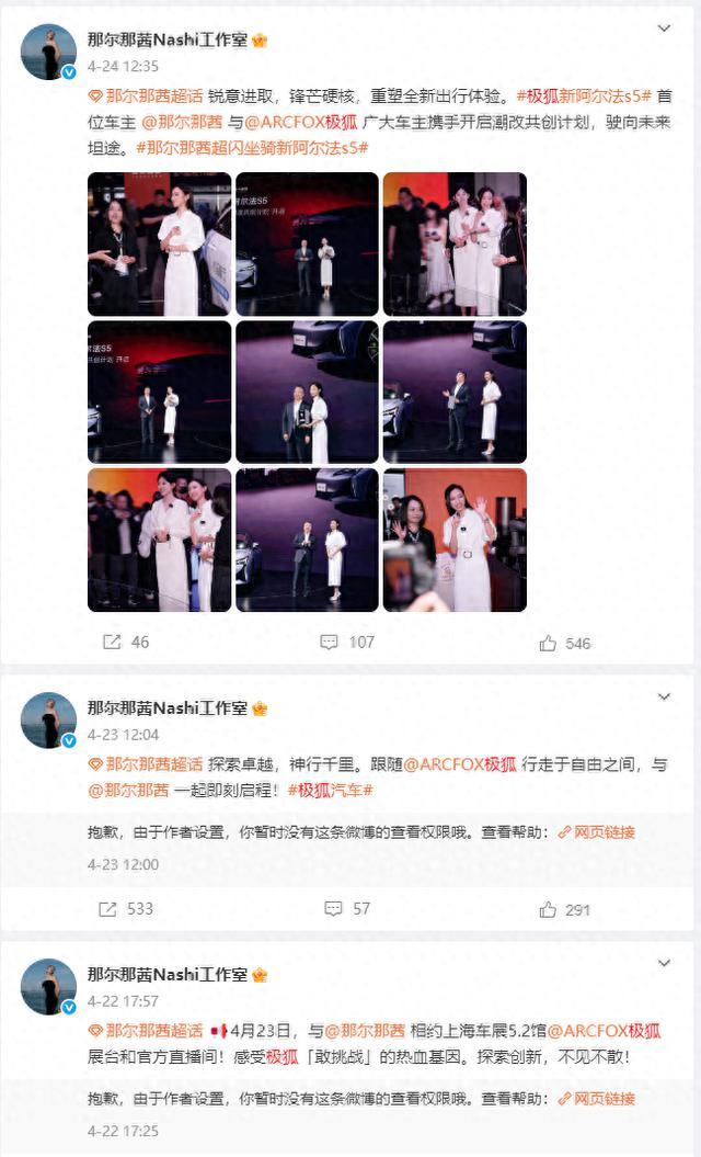 记者注意到,今年2月和4月,那尔那茜个人和工作室微博账号都发布了几条极狐汽车相关的微博,其中称那尔那茜是极狐汽车品牌大使。那尔那茜工作室转发的两条极狐汽车有关的微博,转发的来源未能正常显示。