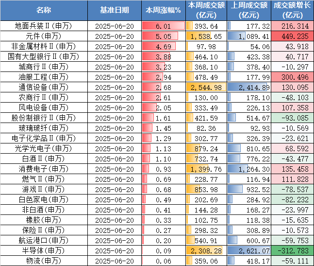 1)受海外冲突催化而走强的地面兵装、油服工程,均继续走强,板块量价齐升;