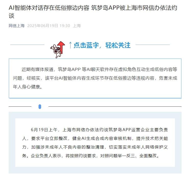 6月19日上午,上海市网信办依法约谈筑梦岛APP运营企业主要负责人,要求平台立即整改,健全AI生成合成内容审核机制,提升技术把关能力,加强涉未成年人不良内容的整治清理,切实落实未成年人网络保护义务。企业负责人表示,将按照约谈要求,对照问题举一反三、全面整改。