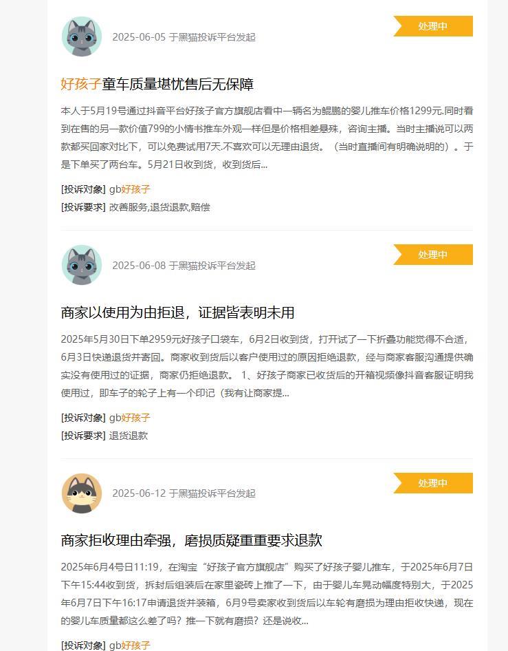 极目新闻记者搜索发现,在黑猫投诉、12315等投诉平台上,有类似遭遇的消费者不在少数。针对该情况,6月17日,极目新闻记者致电好孩子官方客服热线。其售后服务部门人员表示,品牌支持7天无理由退货政策,但前提是商品“不影响二次销售”。关于“不影响二次销售”的具体标准,对方表示,品牌售后会将从车架无划痕、布套无脏污和勾丝破损、车轮无明显使用痕迹及功能完好三个方面进行检验,只要符合这些条件,均可办理退货。其中,关于“车轮无明显使用痕迹”是否有评判标准,该工作人员并未给出进一步说明。