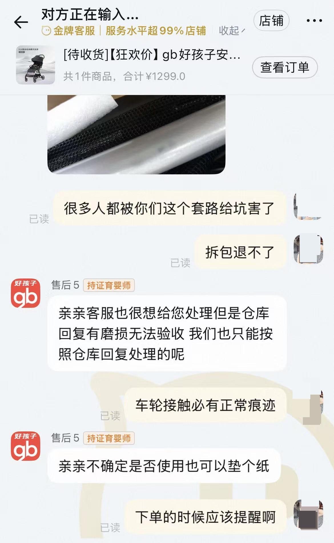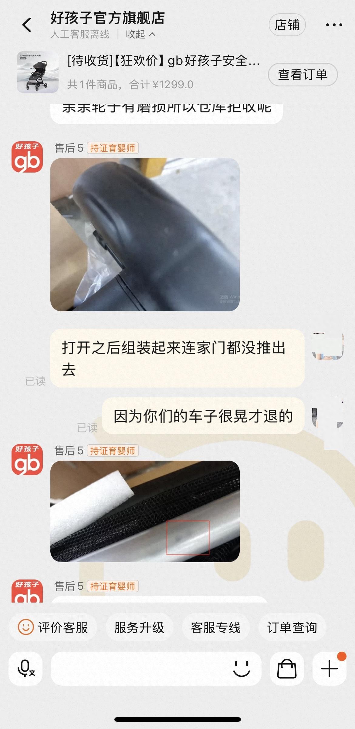 近日,山东的消费者王先生反映:他网购了一台售价1259元的好孩子“鲲鹏Pro”婴儿车,收到货后在家里试推了一下,感觉车子晃动幅度较大,当日便在平台提交了退货退款申请。本以为符合7天无理由退货流程会顺利推进,但快递却被收件方拒绝接收,理由是轮子有磨损。