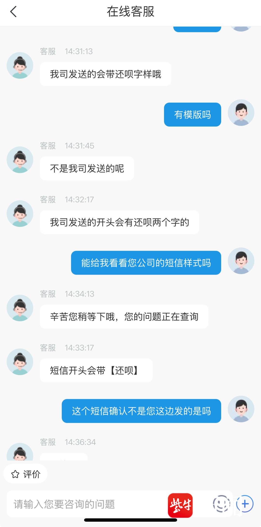 客服表示公司发送短信会有“还呗”二字