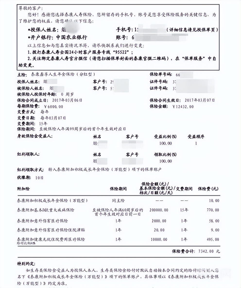 俎先生为孩子购买的保险,分别是泰康人寿泰康财富人生E款年金保险(分红型)和泰康鑫享人生年金保险(分红型)。俎先生向记者提供的保险材料显示:泰康财富人生E款年金保险(分红型)每期保险费为3000元,交费期间为20年,该份保险合同生效日为2013年7月23日;泰康鑫享人生年金保险(分红型)每期保险费为6000元,交费期间为15年,保险合同生效日为2017年3月7日。