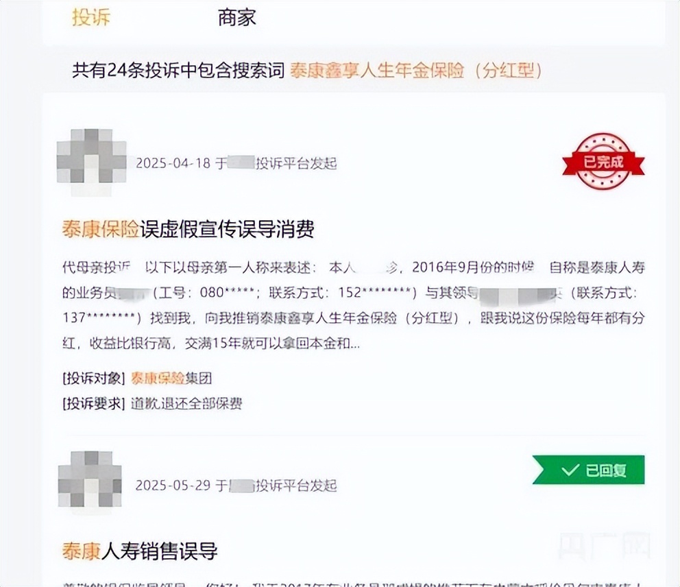 黑猫平台关于泰康鑫享人生年金保险(分红型)的投诉(央广网发 记者截图)