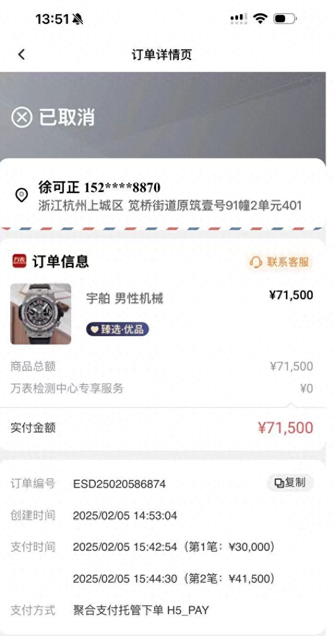 徐先生介绍,今年2月5日,他在万表名表珠宝APP上购买了一款价格为71500元的宇舶机械手表。起初,客服承诺七天左右即可发货,但七天过后徐先生仍未接到发货通知,随即询问客服,对方回复称师傅正在走时试调,需要时间。