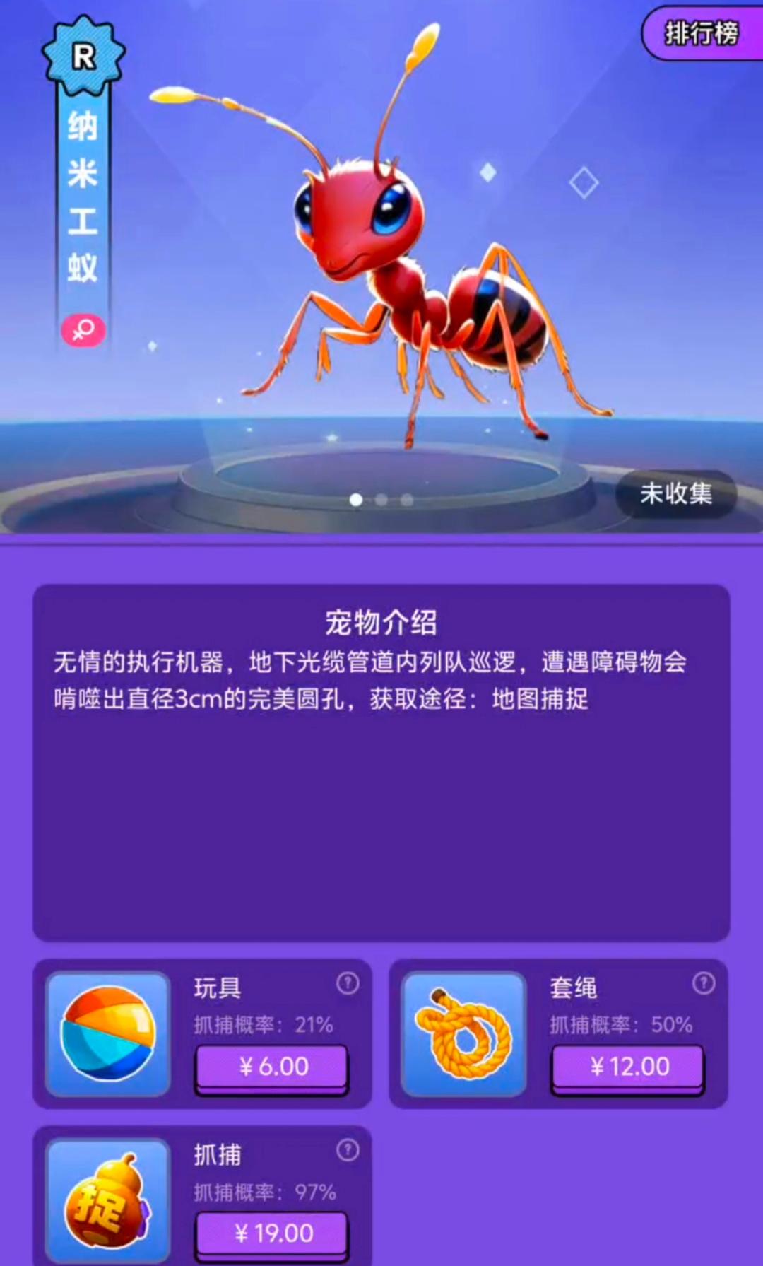 以R级的纳米工蚁为例,用户可以花6元人民币购买玩具诱捕,抓捕成功的概率为21%;也可以花12元购买套绳,成功概率为50%;还可以花19元进行抓捕,成功概率为97%。